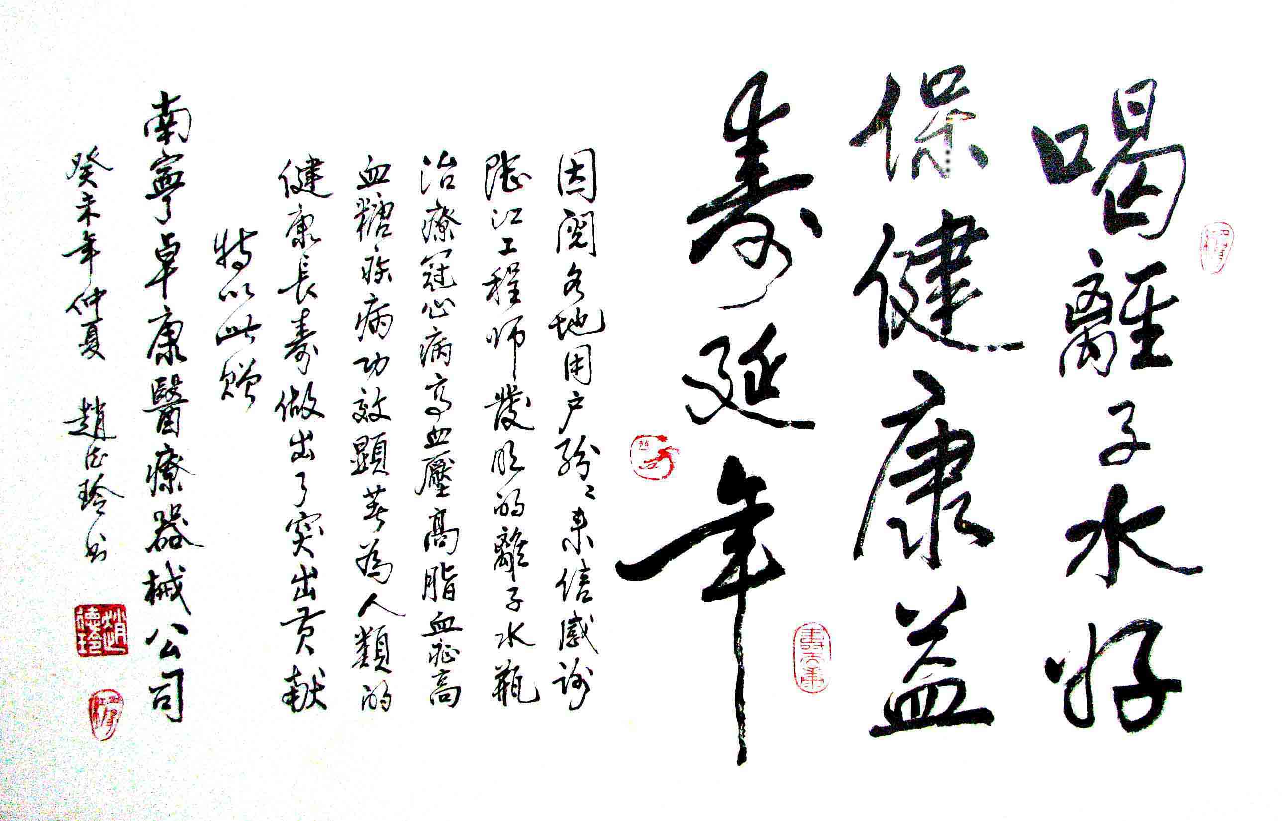 本品大量用戶的使用效果表明,能治愈冠心病、腦動脈硬化、原發(fā)性高(低)血壓、高血脂、高粘血癥、高血尿酸癥(痛風(fēng))和2型糖尿病、衰弱器官并發(fā)癥(前列腺增生、腎衰與尿毒癥)及中風(fēng)后遺癥等療效好。產(chǎn)品配信譽卡。使用壽命30年,不換芯,易清洗。團購優(yōu)惠。從郵局匯款,匯費1%,地址按本頁下方地址、聯(lián)系人寫。從銀行匯款,請點擊[聯(lián)系匯款]欄,從工商銀行匯款,建設(shè)銀行、農(nóng)業(yè)銀行匯款,均免收匯費,匯款后20--30分鐘內(nèi)發(fā)短信,可用微信轉(zhuǎn)帳,均免匯費,微信號即手機號13768308380。匯款后,告知你的姓名和地址,我公司聯(lián)系人手機號是:13768308380卓康牌離子水瓶為我公司獨家生產(chǎn),郵購產(chǎn)品配《補水的大智慧》彩印書一本,另配四季出版社出版的新書《補水的大智慧》一本,并配光盤一張(含央視主持人釆訪陸江的對話視頻)。目前市場和"淘寶網(wǎng)"上有人兜售假冒的偽品,望讀者審察辯別真?zhèn)危旒僬哓飧`假冒本公司的各種證、獲獎獎項、專利號和外包裝盒上的中英文字,包括科技成果的鑒定意見等,請讀者注意防偽。如何識別假貨?已經(jīng)買了假貨怎么辦?(請點擊[打假掠影][打假掠影])。